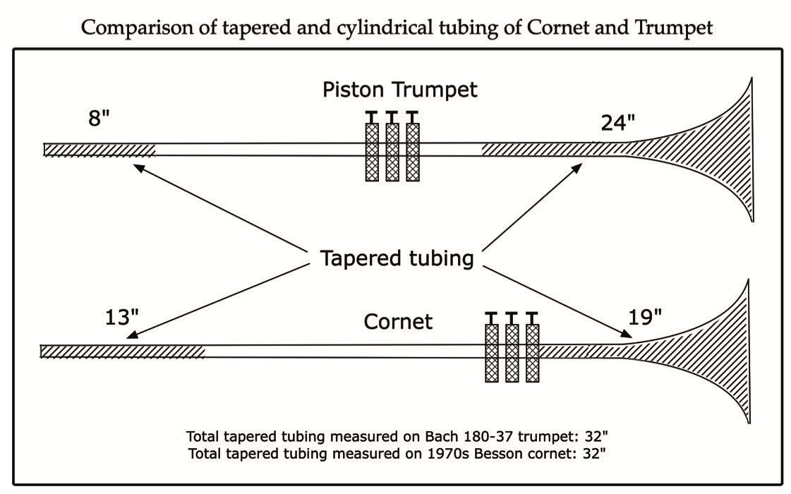 Many think that the tubing of the cornet is conical whereas the trumpet is cylindrical. This is incorrect. Both instruments have roughly the same proportion of tapered to straight tubing as the accompanying graphic shows. Both the measured instruments have bores starting at around 0.335” at the mouthpiece entry, 0.459” though the valve section, and 4.8” at the bell.